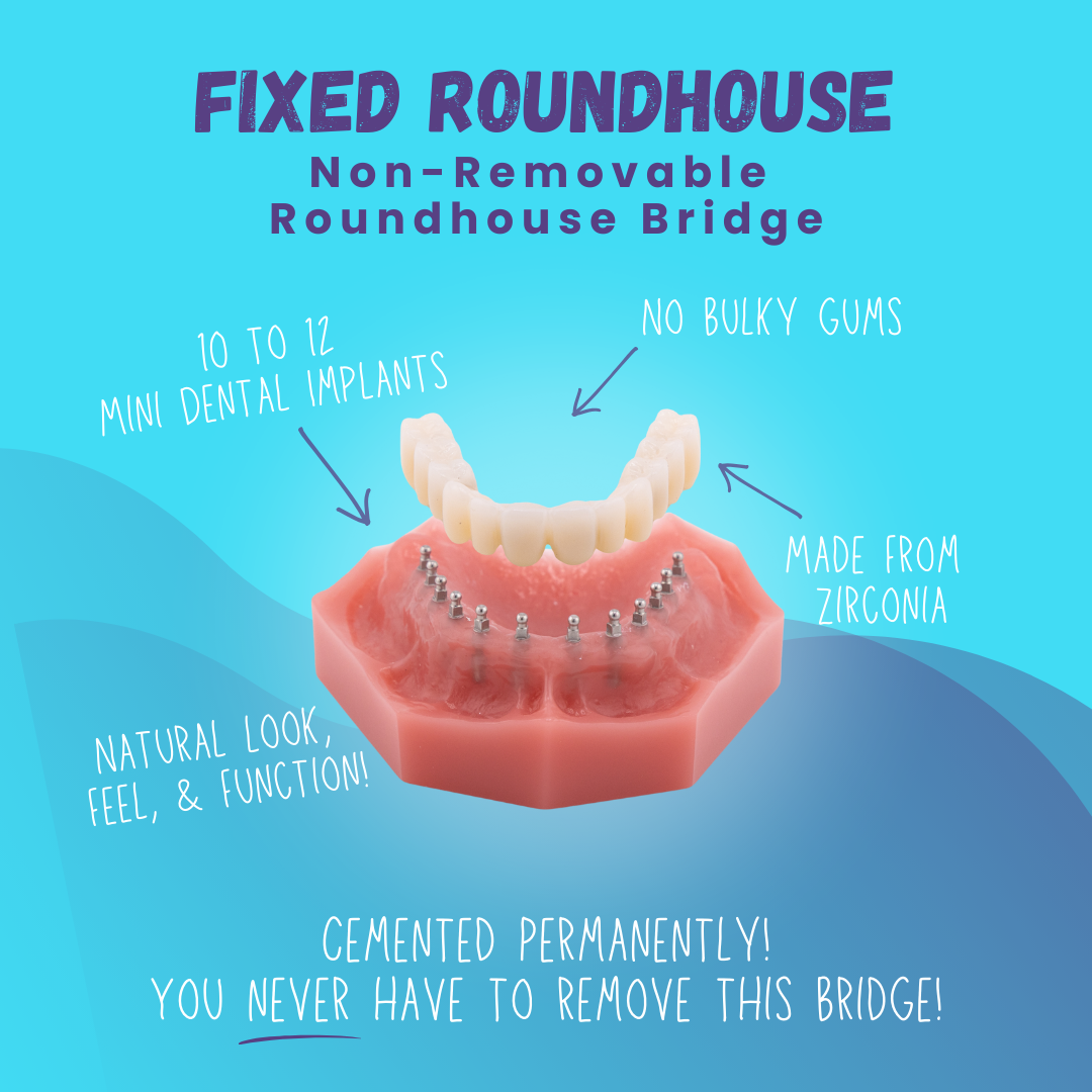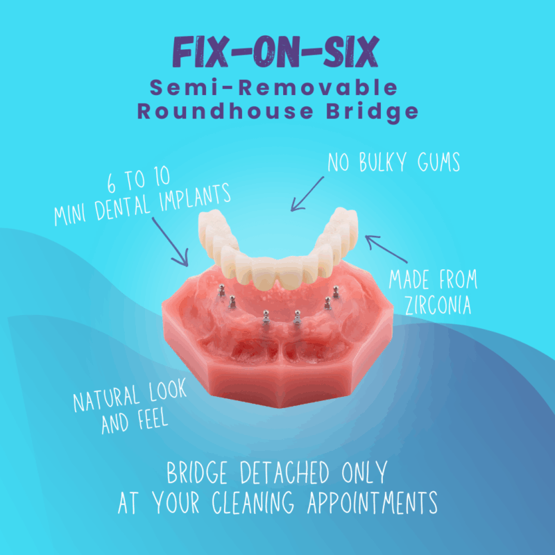 Restore your smile with a solution matched to your needs. Options include removable snap-on dentures, semi-removable Fix-on-Six bridges, and permanently cemented roundhouse bridges. Mini dental implants provide secure, natural-looking teeth without bulky gums or adhesives, supporting comfort, stability, and daily function.