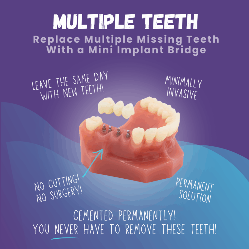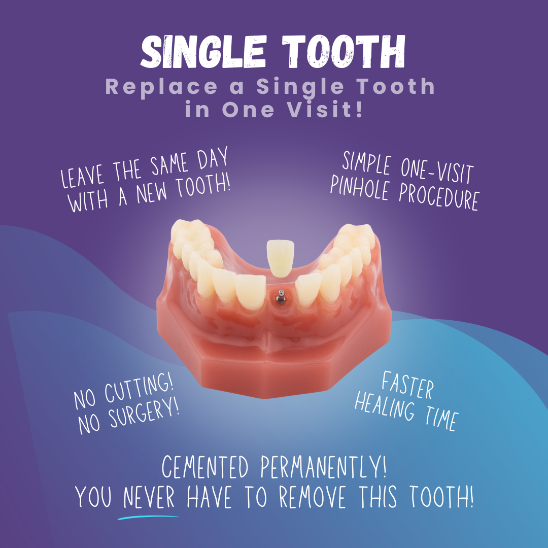 Whether you need to replace a single tooth or multiple teeth, our minimally invasive, pain-free solution ensures no cutting, no stitching, and same-day results so you can leave with a confident smile!